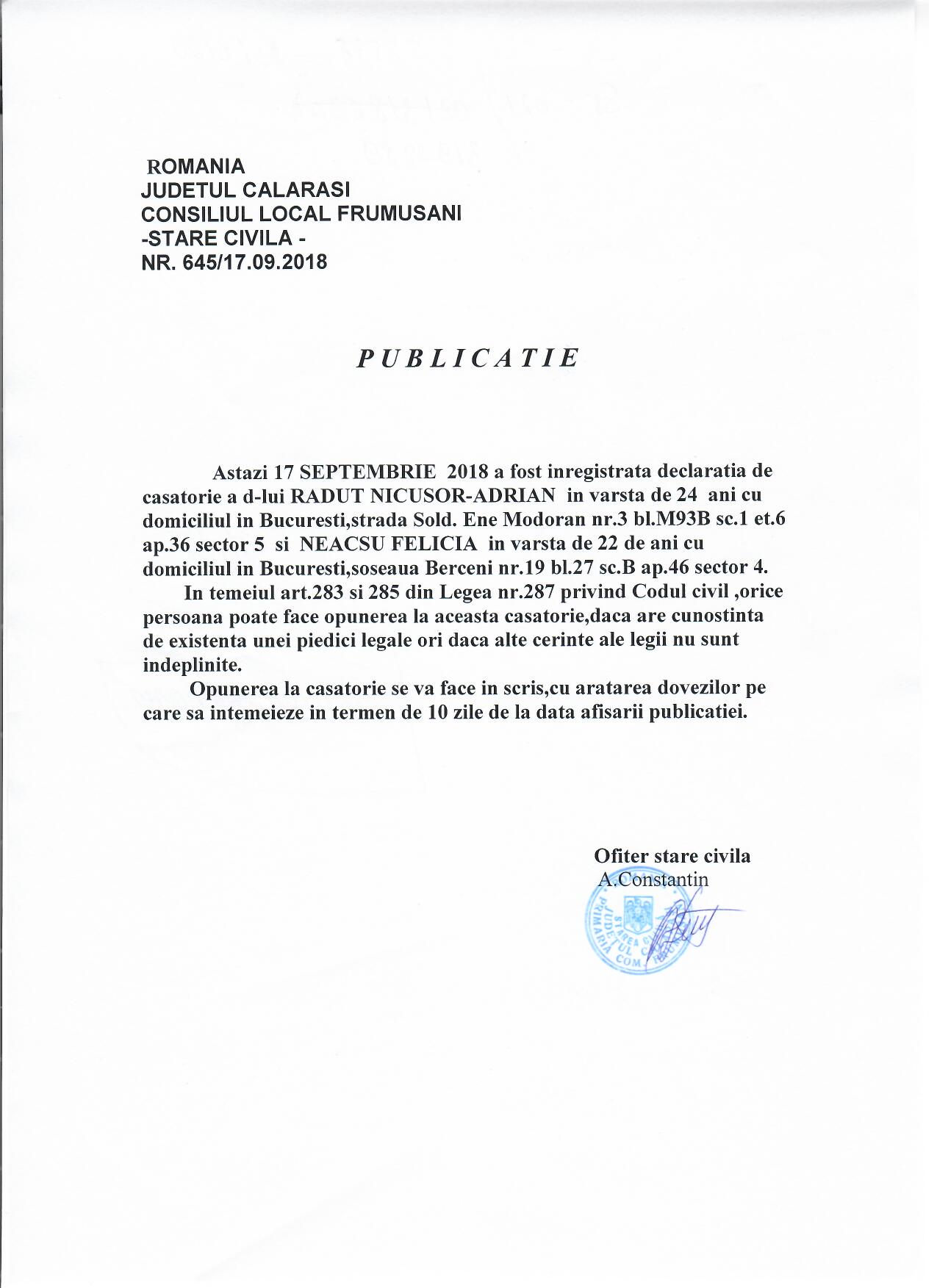 Stare Civila 17 September 2018 Hits: 1158 Declaratie de casatorie - Radut Nicusor si Neacsu Felicia Print Email PDF Declaratie de casatorie - Radut Nicusor si Neacsu Felicia Prev Next