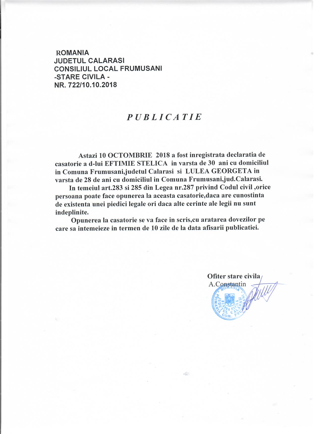 Stare Civila 10 October 2018 Hits: 1118 Declaratie de casatorie - Eftimie Stelica si Lulea Georgeta Print Email PDF Prev Next