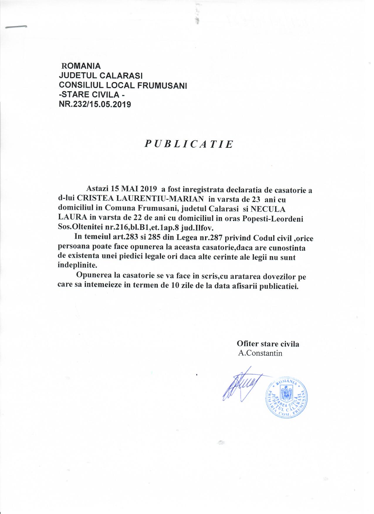 Stare Civila 15 May 2019 Hits: 1472 Declaratie de casatorie - CRISTEA LAURENTIU-MARIAN/NECULA LAURA Print Email PDF Prev Next