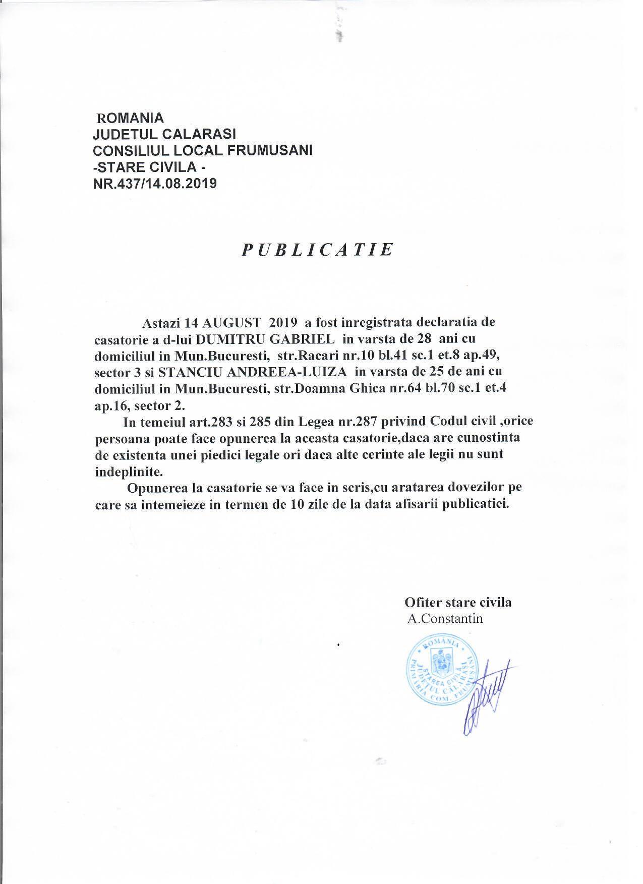 Stare Civila 14 August 2019 Hits: 979 Declaratie de casatorie - DUMITRU GABRIEL/STANCIU ANDREEA-LUIZA Print Email PDF Prev Next