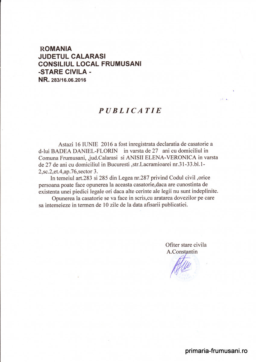 Stare Civila 16 June 2016 Hits: 1932 Declaratie de casatorie - Badea Daniel - Florin si Anisii Elena - Veronica Print Email PDF Prev Next