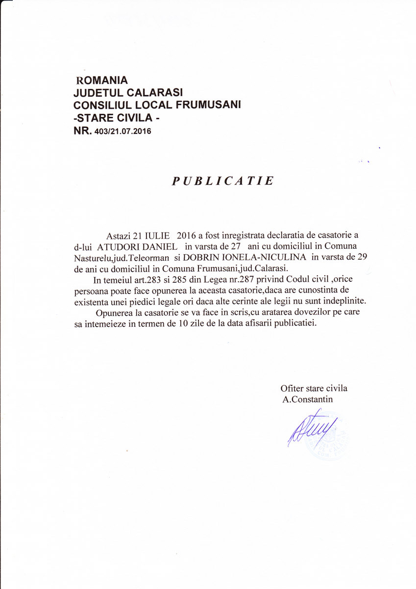 Stare Civila 22 July 2016 Hits: 1843 Declaratie de casatorie - Atudori Daniel si Dobrin Ionela Print Email PDF Prev Next