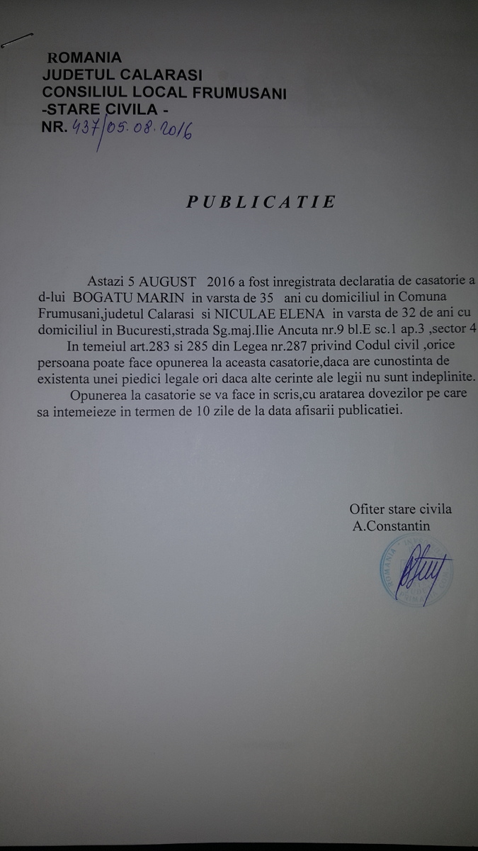 Stare Civila 08 August 2016 Hits: 1925 Declaratie de casatorie - Bogatu Marin si Niculae Elena Print Email PDF Prev Next