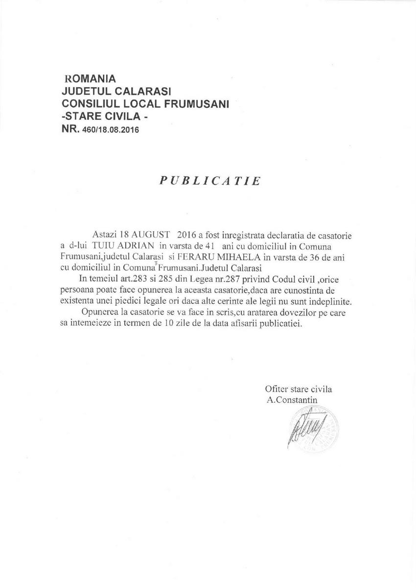 Stare Civila 19 August 2016 Hits: 2040 Declaratie de casatorie - Tuiu Adrian si Feraru Mihaela Print Email PDF Prev Next