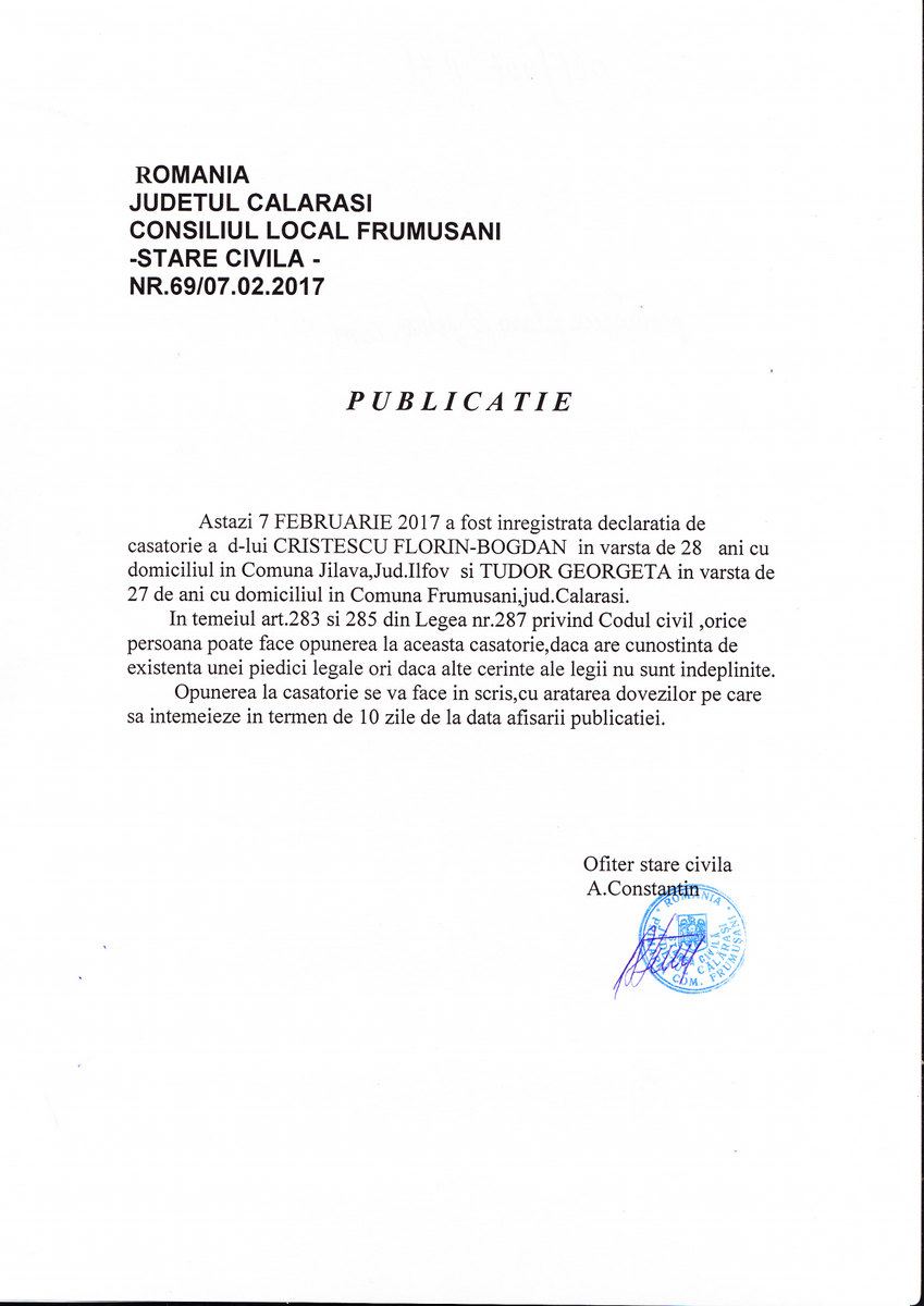 Stare Civila 07 February 2017 Hits: 1943 Declaratie de casatorie - Cristescu Florin si Tudor Georgeta Print Email PDF Prev Next