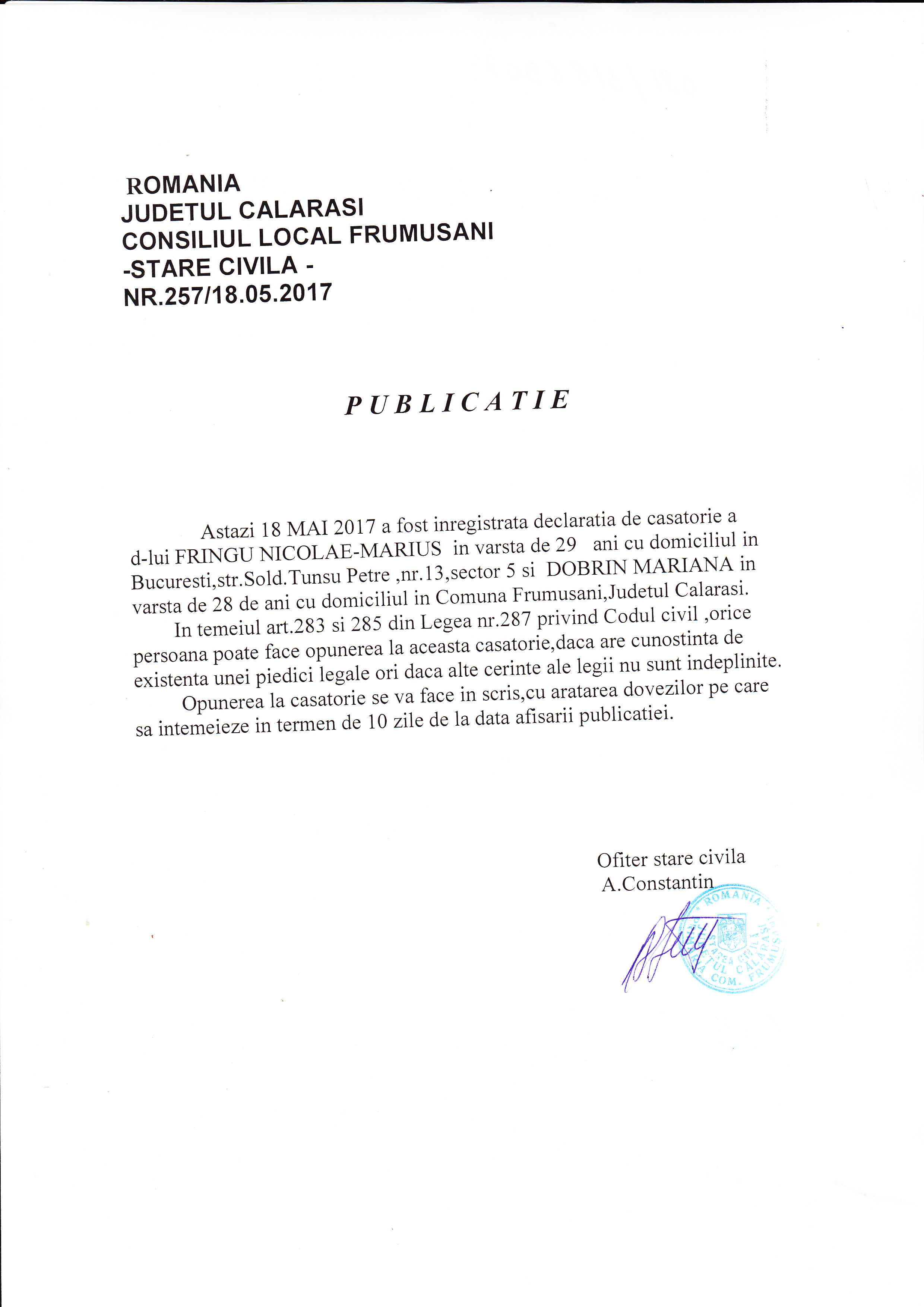 Stare Civila 18 May 2017 Hits: 1570 Declaratie de casatorie - Fringu Nicolae si Dobrin Mariana Print Email PDF Prev Next