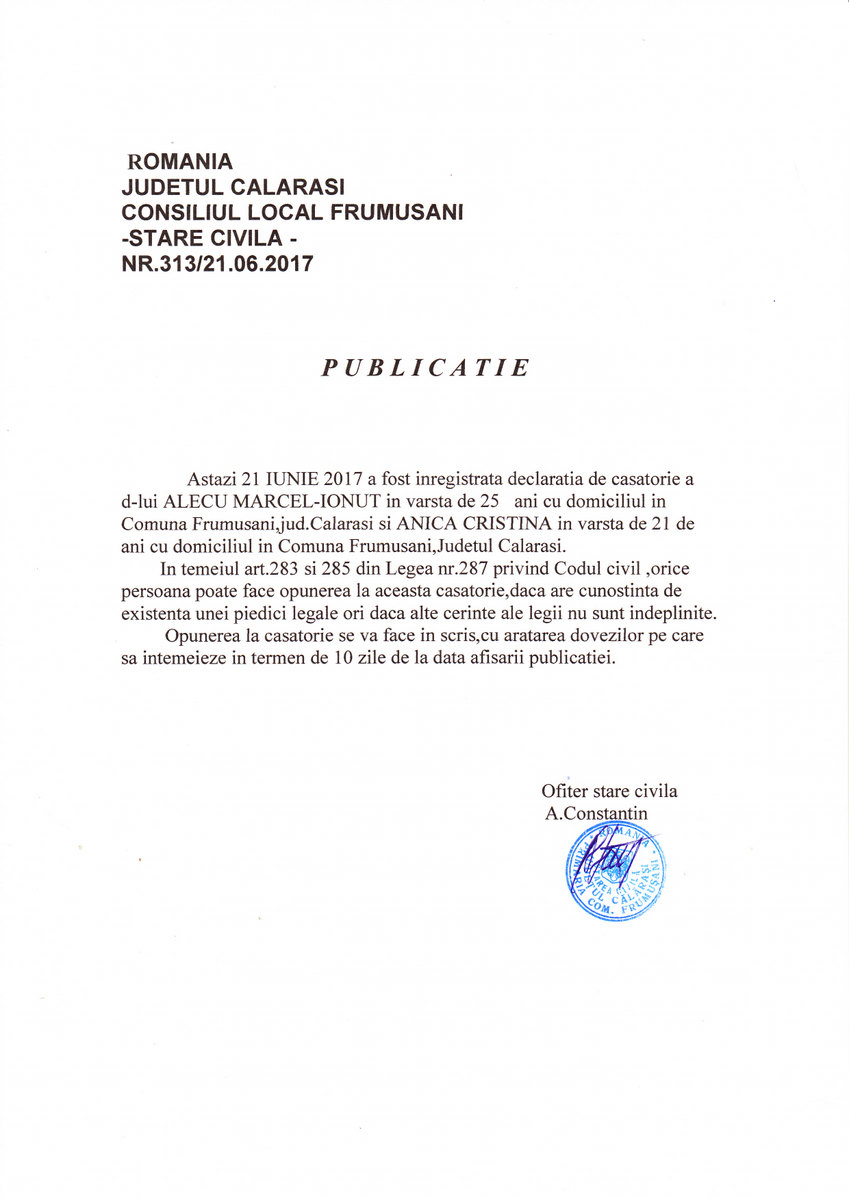 Stare Civila 22 June 2017 Hits: 1587 Declaratie de casatorie - Alecu Marcel si Anica Cristina Print Email PDF Prev Next