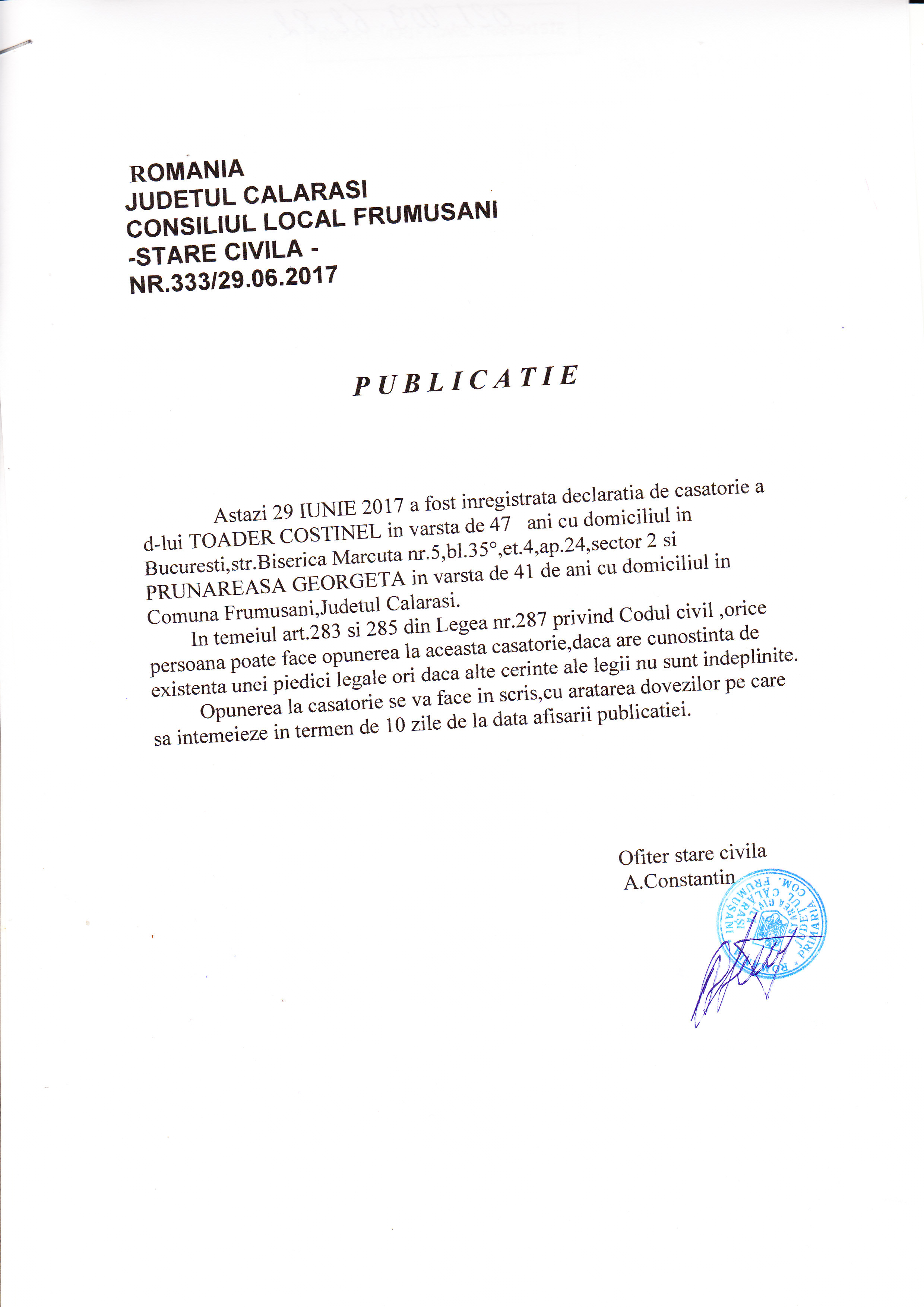 Stare Civila 29 June 2017 Hits: 1490 Declaratie de casatorie - Toader Costinel si Prunareasa Georgeta Print Email PDF Prev Next