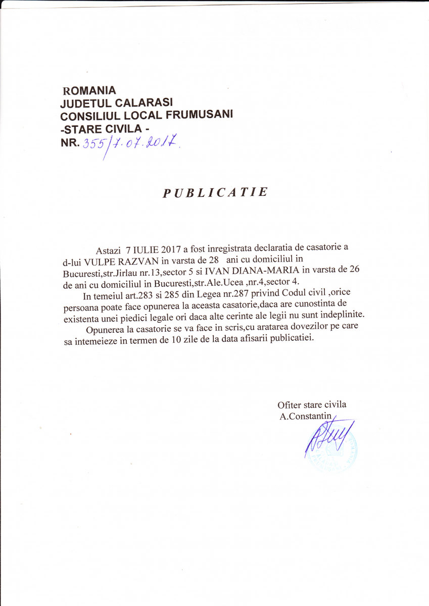 Stare Civila 07 July 2017 Hits: 1515 Declaratie de casatorie - Vulpe Razvan si Ivan Diana-Maria Print Email PDF Prev Next