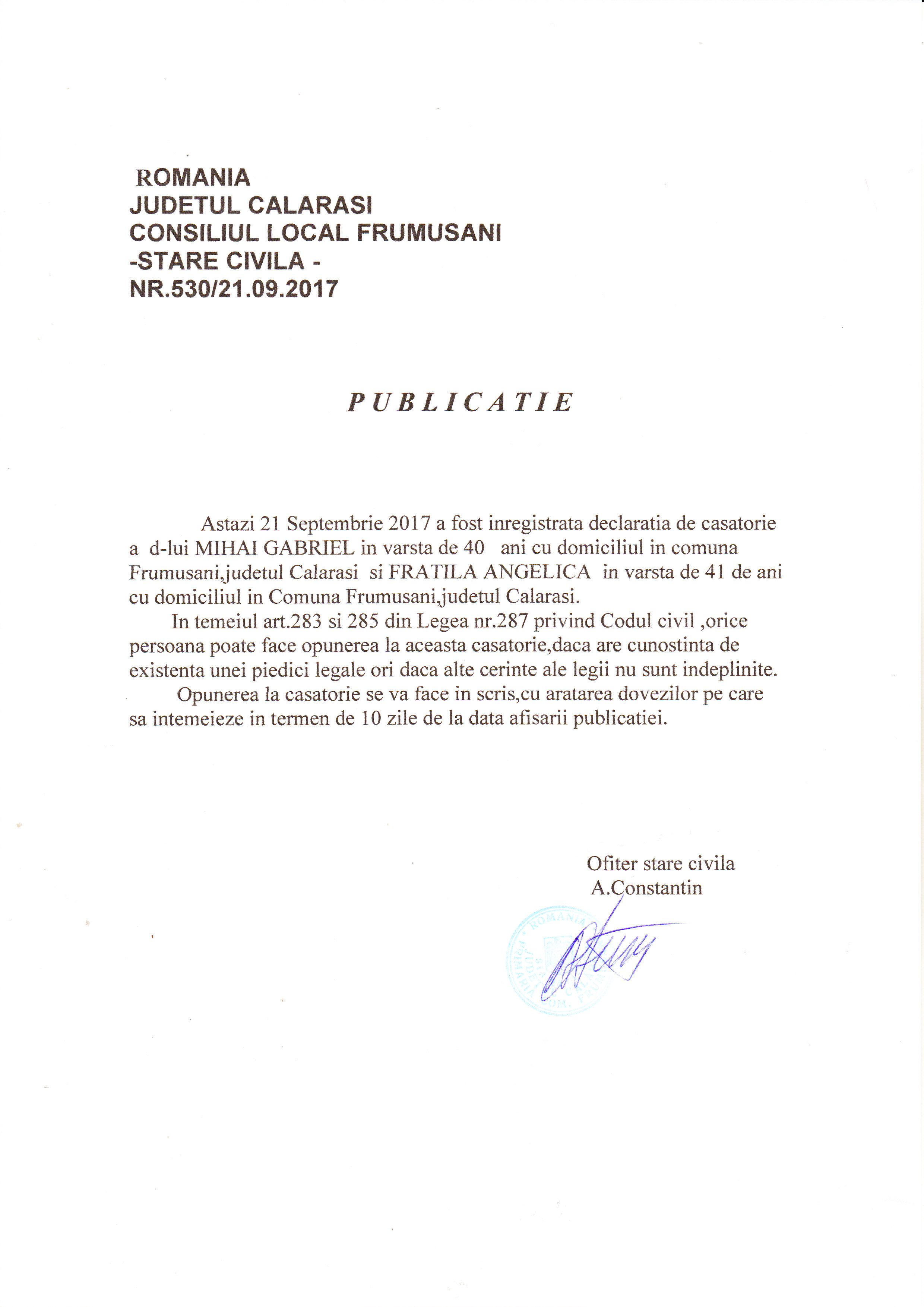 Stare Civila 21 September 2017 Hits: 1474 Declaratie de casatorie - Mihai Gabriel si Fratila Angelica Print Email PDF Prev Next