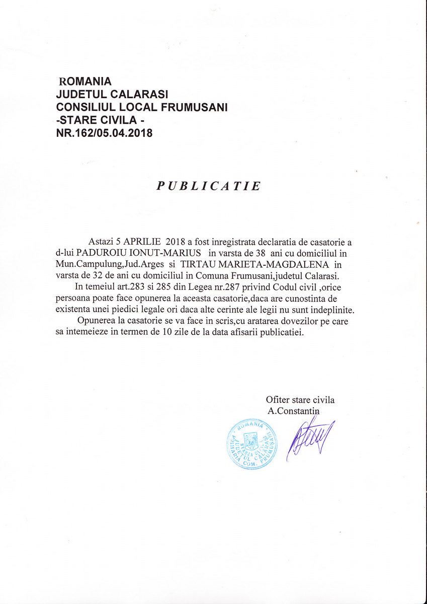 Stare Civila 05 April 2018 Hits: 1326 Declaratie de casatorie - Paduroiu Ionut si Tirtau Marieta Print Email PDF Prev Next