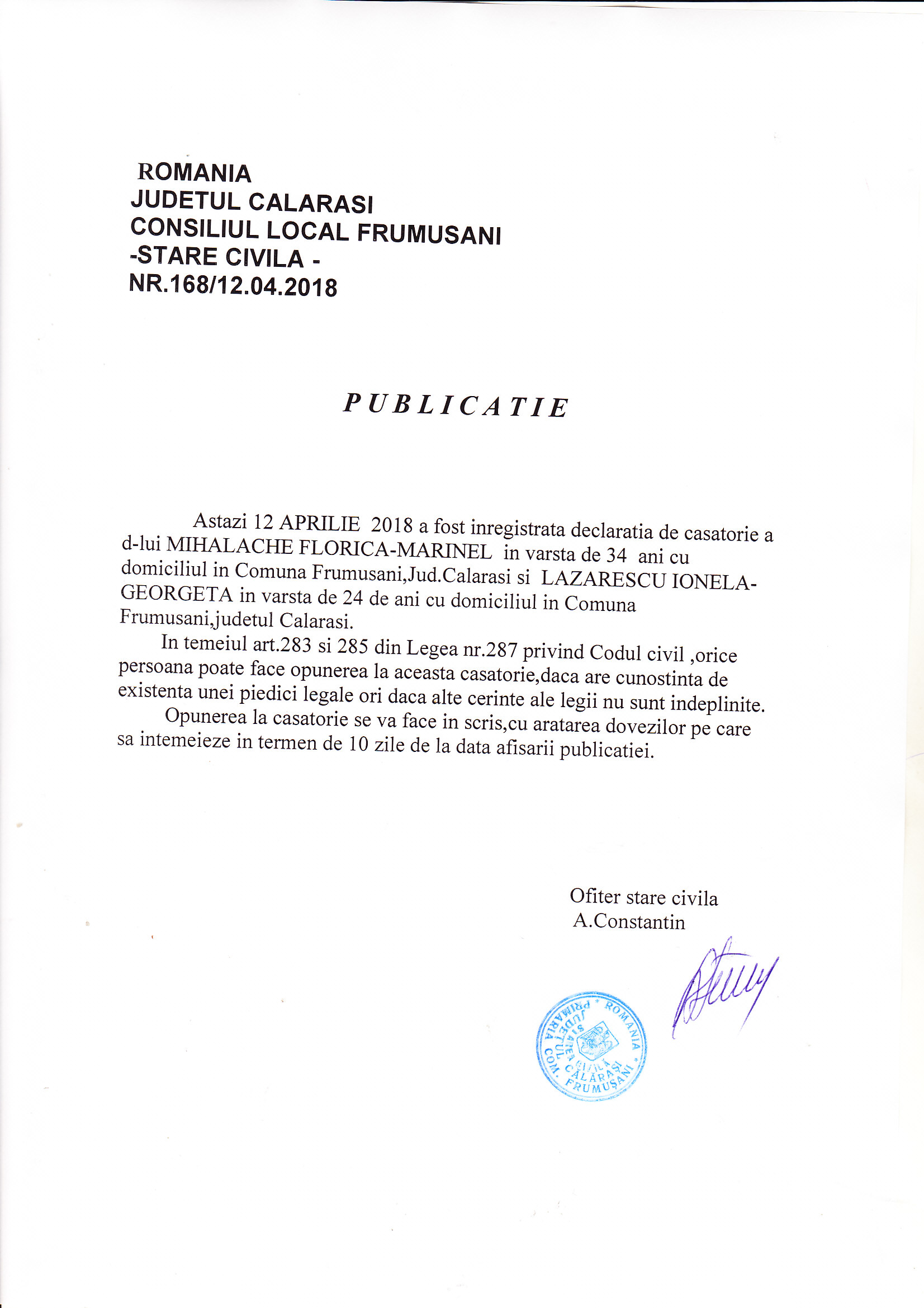 Stare Civila 12 April 2018 Hits: 1208 Declaratie de casatorie - Mihalache Florica si Lazarescu Ionela Print Email PDF Prev Next