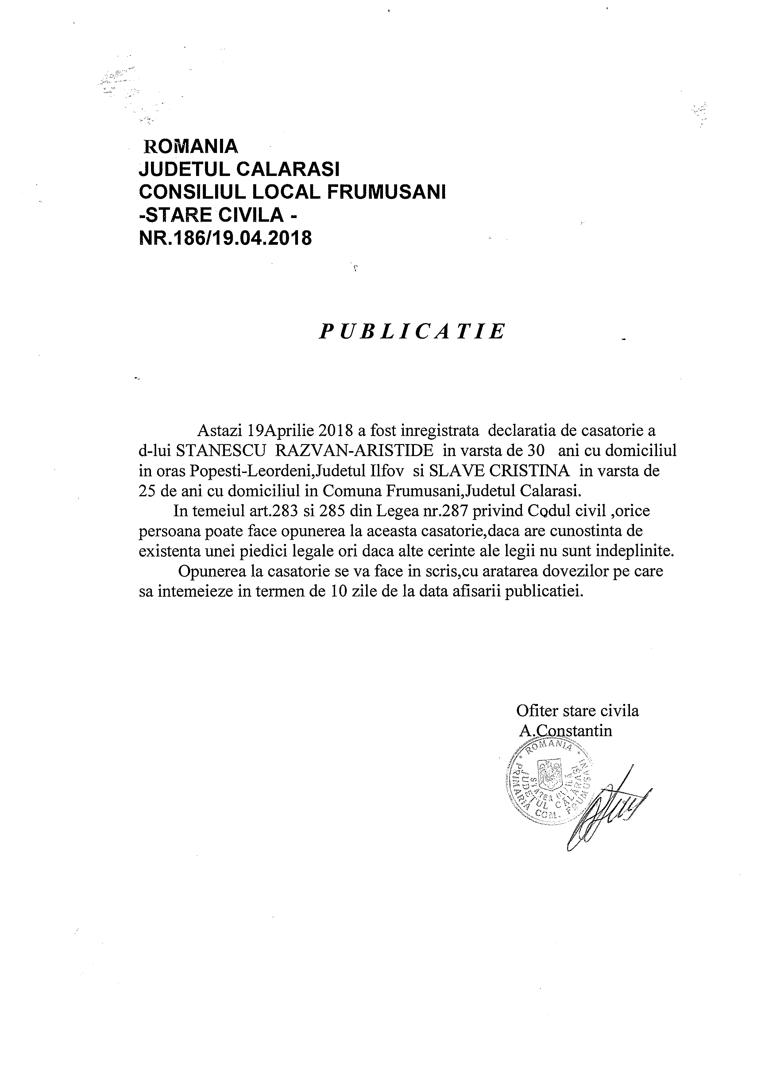 Stare Civila 19 April 2018 Hits: 1263 Declaratie de casatorie - Stanescu Razvan si Slave Cristina Print Email PDF Prev Next