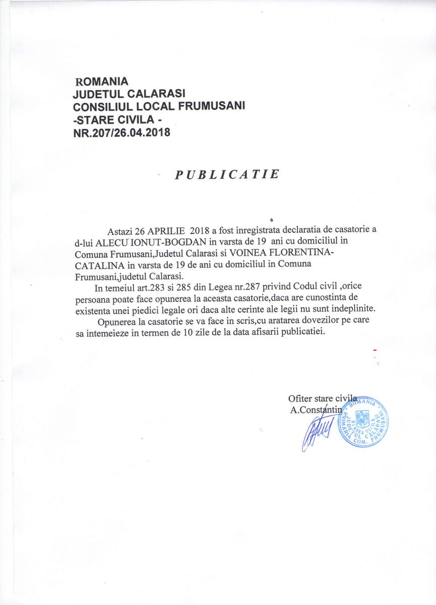 Stare Civila 26 April 2018 Hits: 1185 Declaratie de casatorie - Alecu Ionut si Voinea Florentina Print Email PDF Prev Next