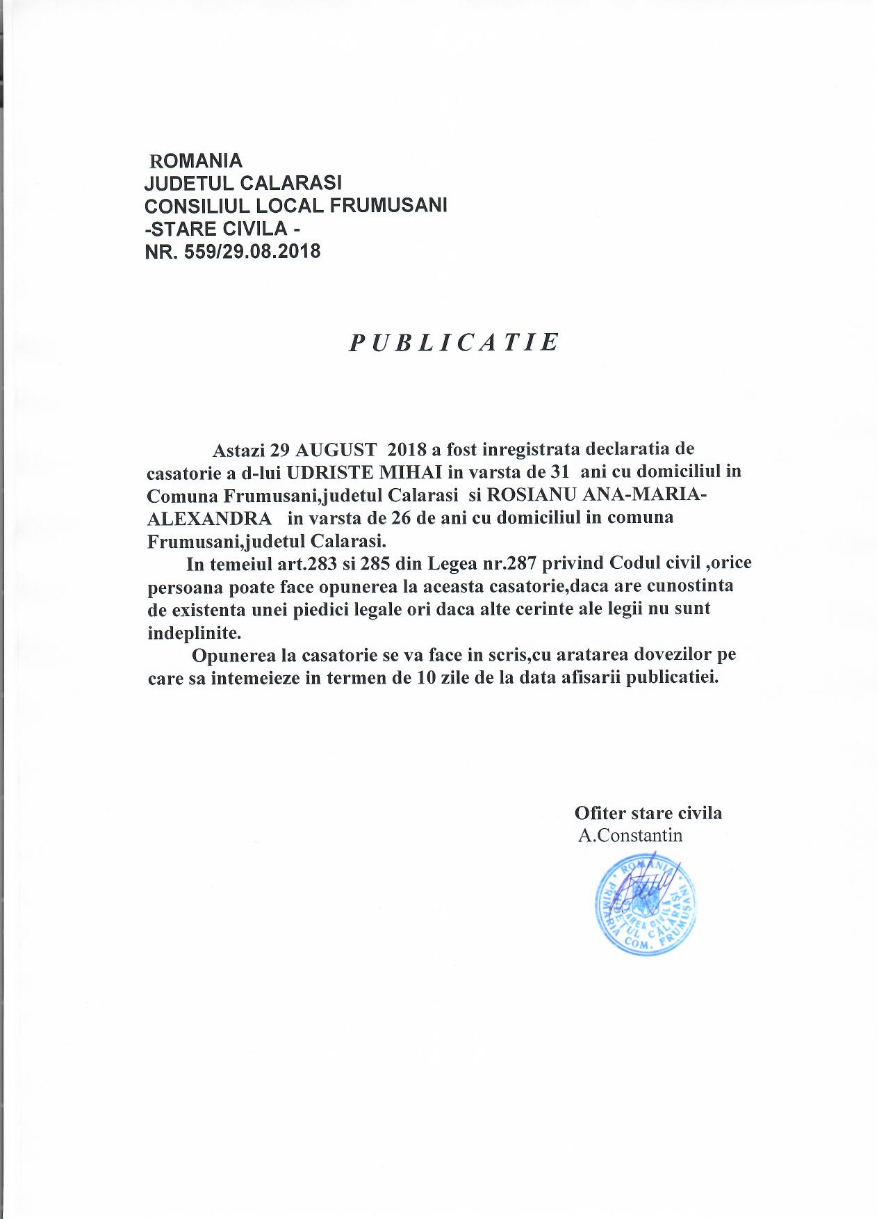 Stare Civila 29 August 2018 Hits: 1246 Declaratie de casatorie - Udriste Mihai si Rosianu Ana-Maria Print Email PDF Declaratie de casatorie - Udriste Mihai si Rosianu Ana-Maria Prev Next