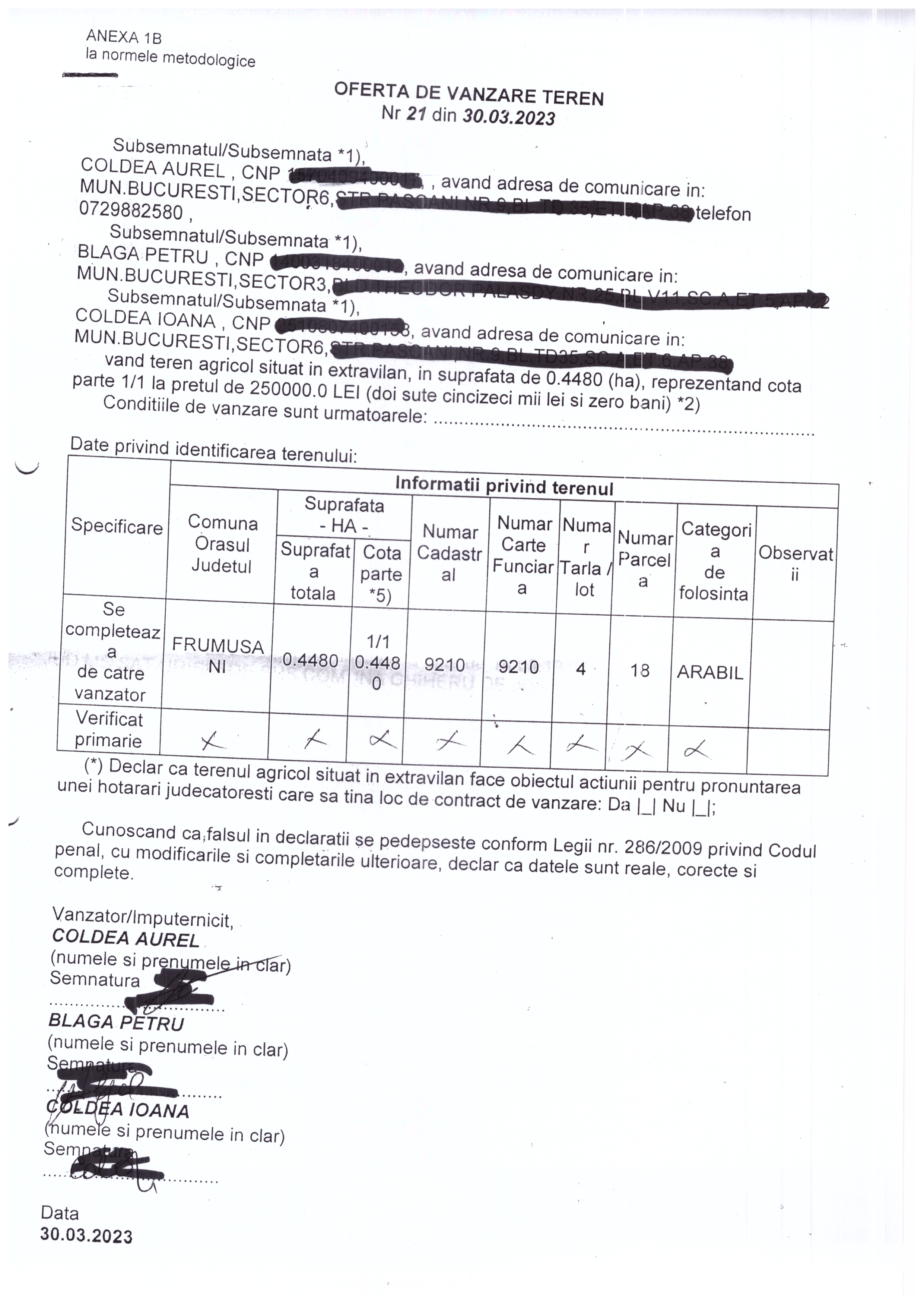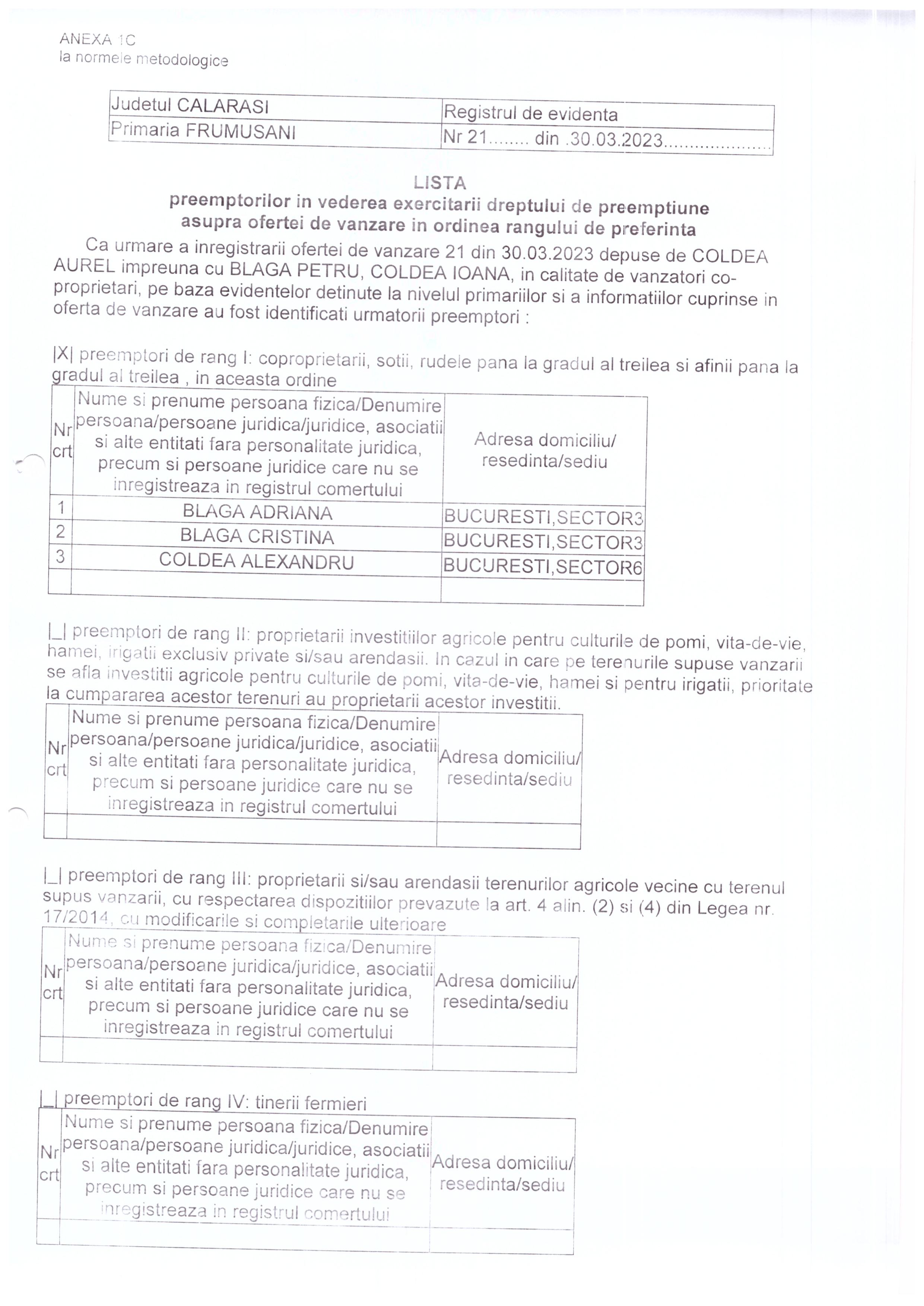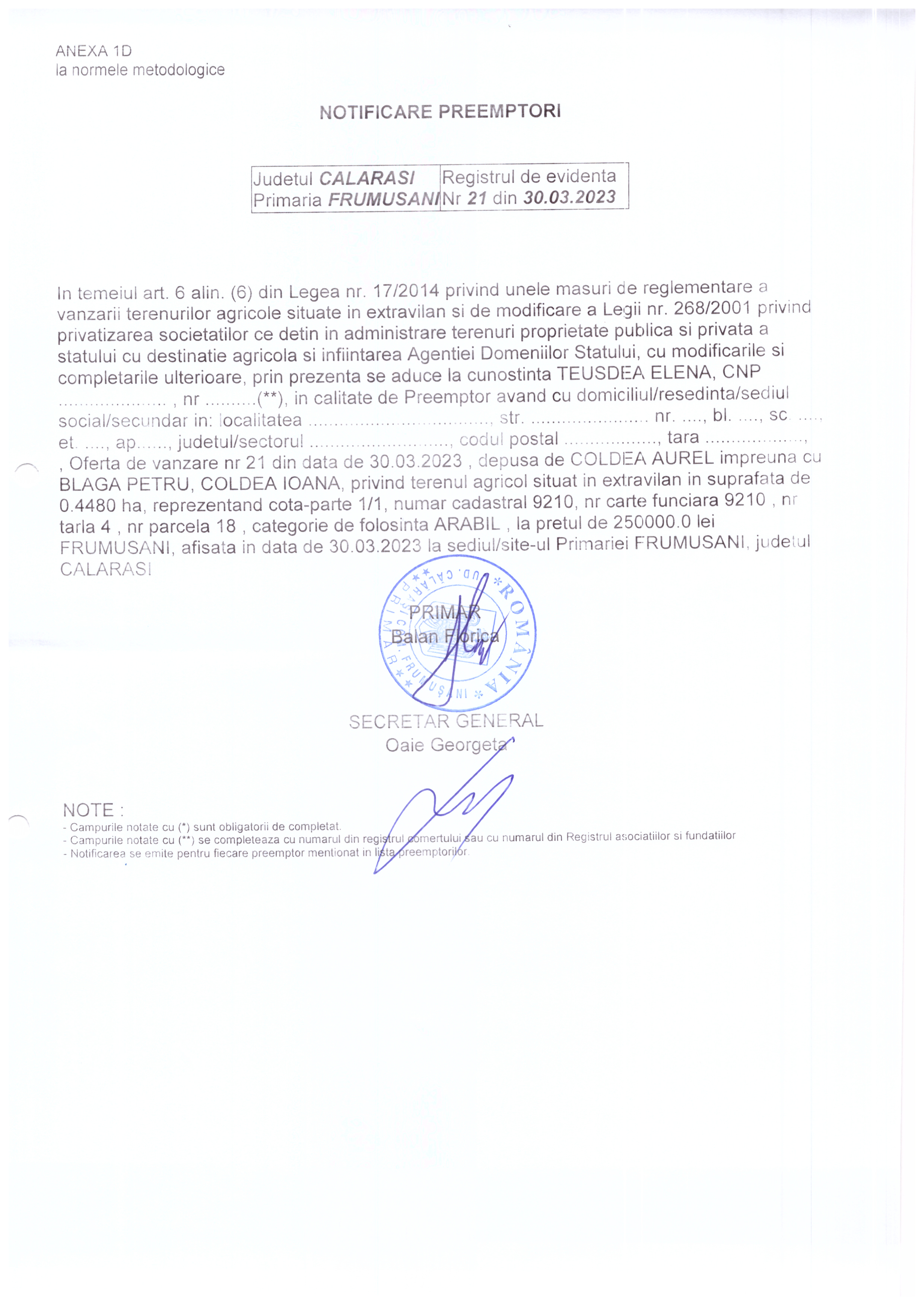 Publicații si oferte Legea nr.17 - extravilan Registrul agricol 03 April 2023 Hits: 628 Oferta vanzare teren si lista preemptori NR.21/30.03.2023 Print Email PDF Prev Next