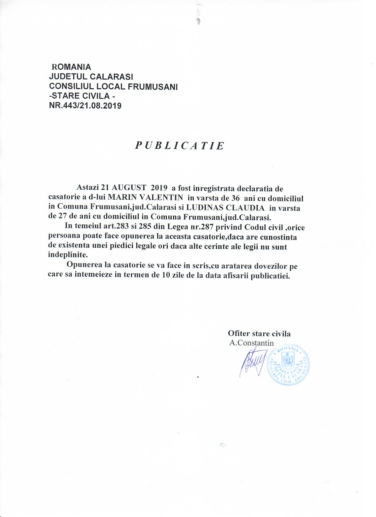 Stare Civila 21 August 2019 Hits: 934 Declaratie de casatorie - MARIN VALENTIN/LUDINAS CLAUDIA Print Email PDF Prev Next