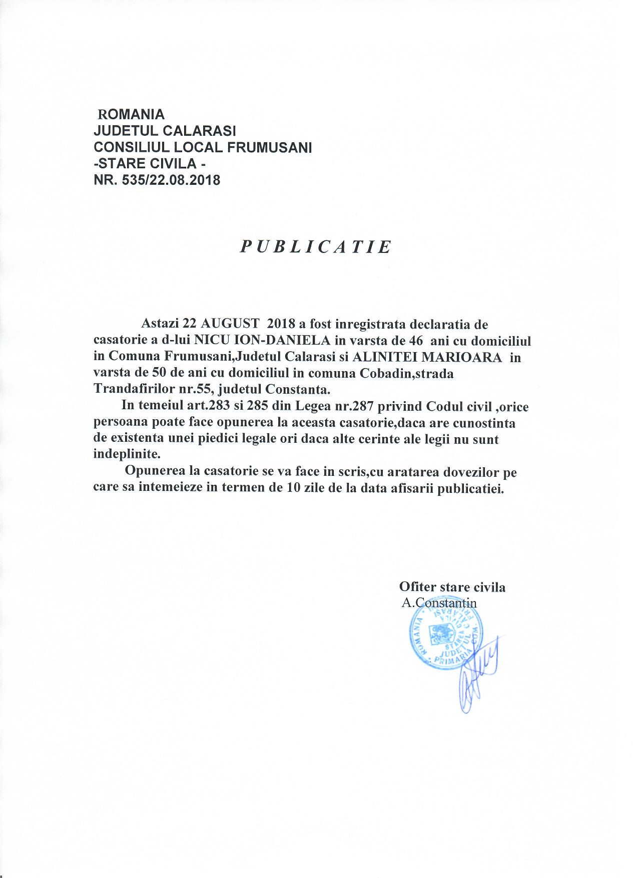 Stare Civila 22 August 2018 Hits: 1075 Declaratie de casatorie - Nicu Ion si Alinitei Marioara Print Email PDF Declaratie de casatorie - Nicu Ion si Alinitei Marioara Prev Next